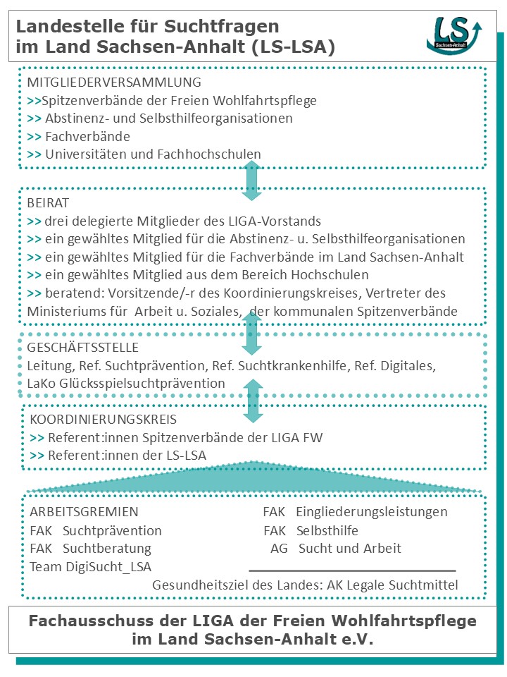 Die LS-LSA ist ein Fachausschuss der LIGA der Freien Wohlfahrtspflege im Land Sachsen-Anhalt e.V., (LIGA) dem Zusammenschluss der im Land tätigen Spitzenverbände der Freien Wohlfahrtspflege. Die LIGA ist ausschließlich gemeinnützig tätig.